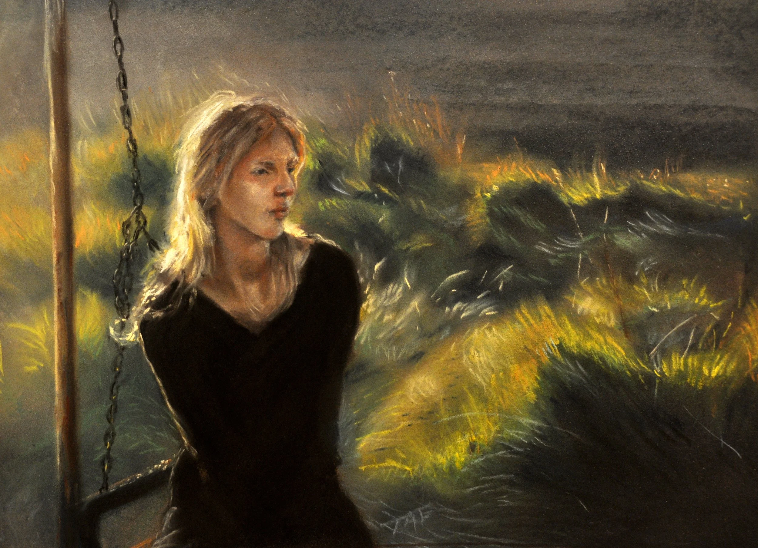 A chalk pastel drawing of a young woman (Jennifer) sitting on a broken swing in tall grass at dusk, rendered on black paper so that shadow precedes light. The figure turns slightly away from the viewer, her face framed by the last light of the day.