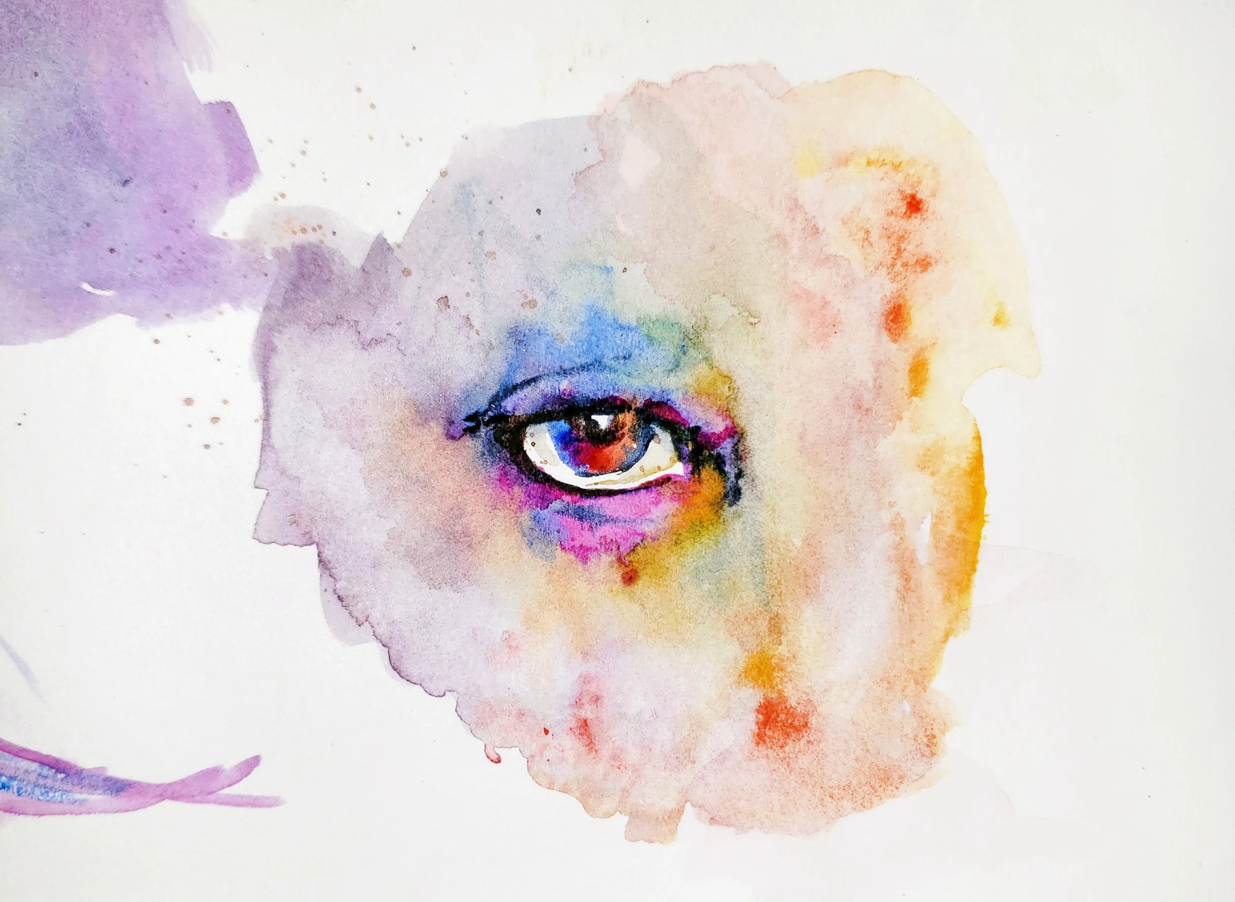 An isolated gaze suspended within a contained field of light and color. A single eye emerges from a full-spectrum watercolor field. Color radiates outward in layered blooms while the eye remains sharply defined, steady and direct.